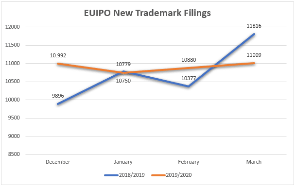 One might expect that reduced budgets would mean an immediate pull-back, and that trademark establishment and marketing activity would come to a halt as brands and entrepreneurs put on hold trademark fillings until the COVID-19 crisis ends. Does the data from PTOs support this?
