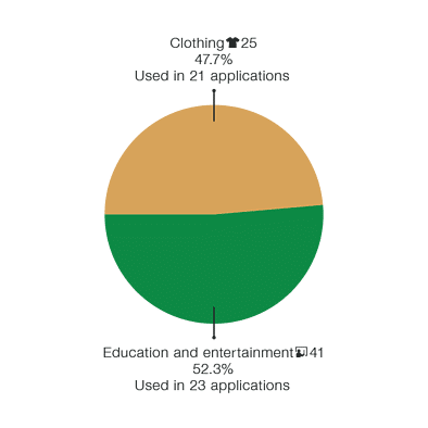 - Top products are all found in class 41 (Education and Entertainment) with Organizing Events for Cultural Purposes, Education, Entertainment and Sport and Entertainment all taking pole position with 37.5%.