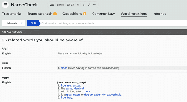 An example of these features can be seen when searching for the mark VERI in class 32 (light beverages) and class 33 (alcoholic beverages, except beer) which reveals the following top word results: