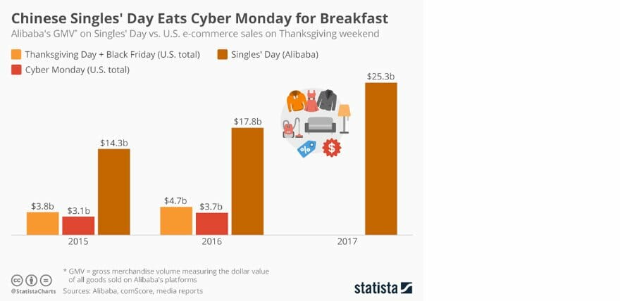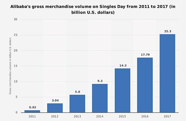 D'un point de vue commercial, la Journée des célibataires dépasse de loin les sommes dépensées par les consommateurs lors du Vendredi noir ou du Cyber lundi. En fait, le marché chinois du commerce électronique était deux fois et demie plus important que celui des États-Unis en 2016.