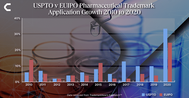 Según los datos de solicitud de marcas encontrados en las clases 1 (Productos químicos), 3 (Cosméticos y productos de limpieza), 5 (Productos farmacéuticos y suministros médicos), 10 (Productos sanitarios) y 44 (Servicios médicos, cosméticos y agrícolas) de Niza de los últimos diez años, tanto la USPTO como la EUIPO han registrado aumentos significativos en los volúmenes globales de solicitudes: un 147% y un 83% respectivamente.
