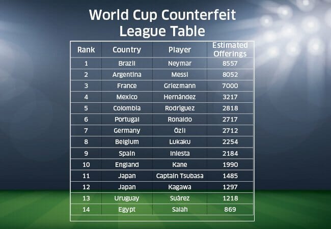 A la cabeza de la clasificación se encuentran dos superestrellas sudamericanas: Neymar, con unas 8.557 ofertas (unos 20 millones de camisetas), seguido de cerca por Lionel Messi, con 8.052. Su popularidad, tanto en sus países como en el resto del mundo, ha demostrado ser un gran objetivo para los falsificadores. Su popularidad, tanto en sus países como en el resto del mundo, es un gran objetivo para los falsificadores. Completa el top 3 el letal rematador francés Antoine Griezmann, con 7.000.