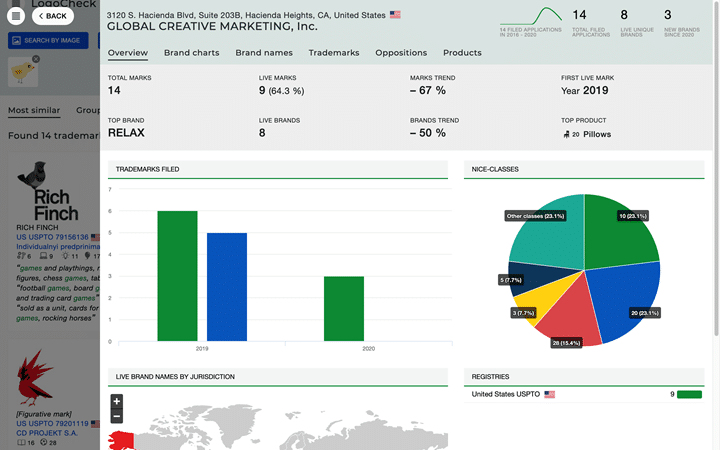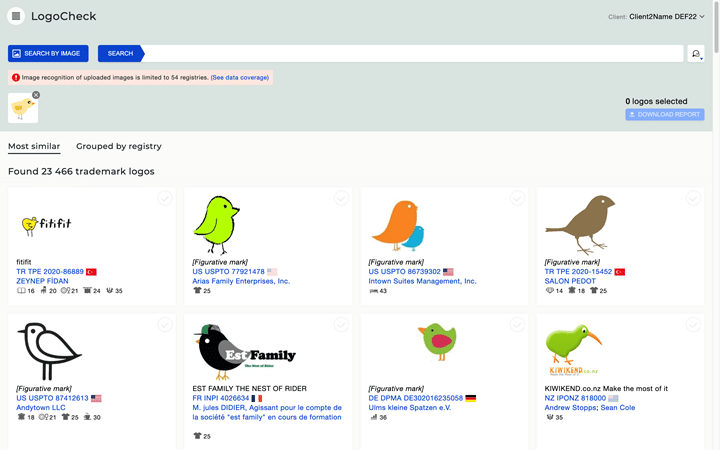 From here, LogoCheck’s AI takes over! It immediately searches across all 54 available countries for similar designs, returns them in decreasing order of similarity, and presents the results.