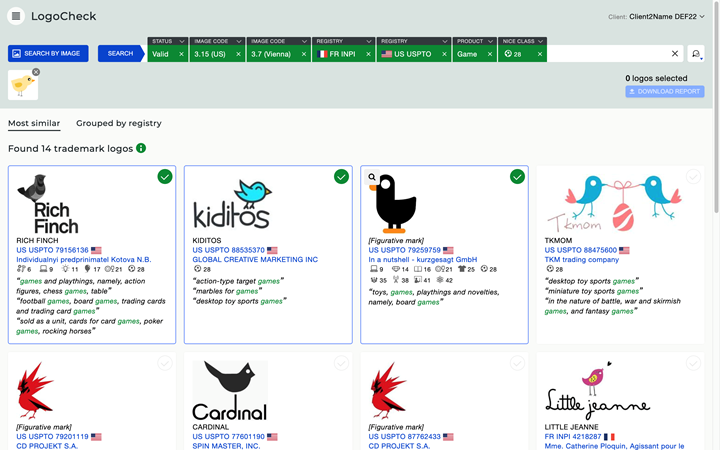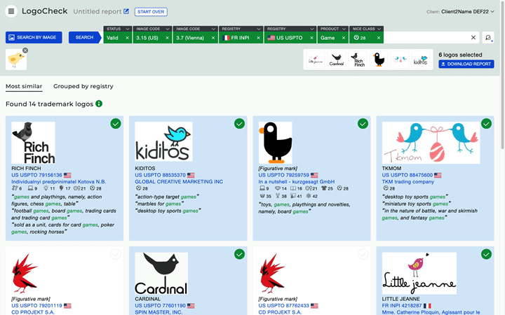 We can select a number of filters from LogoCheck’s Finder Bar to help our hunt, including Trademark Status, Vienna codes and US design codes, specific country registries, Nice (product) Classes, and even key in individual product types, such as “Games”:
