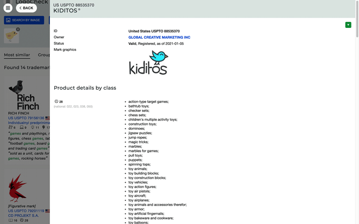 Once the potentially-competing designs are revealed, we can click to review the trademark registry details of individual close matches: