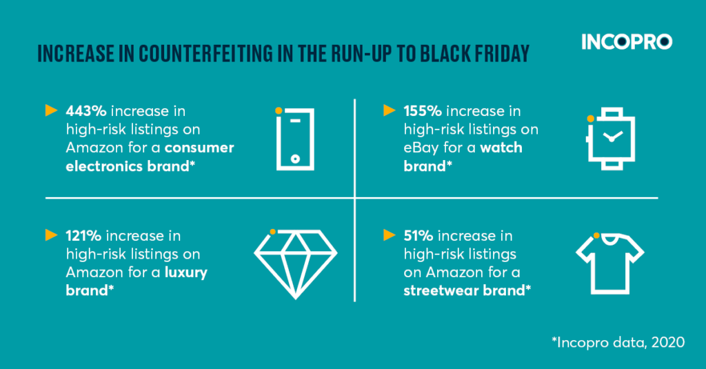 Percentage growth of infringement on Amazon & eBay in the run up to the 2020 holiday season (Corsearch data from 2020) [11]