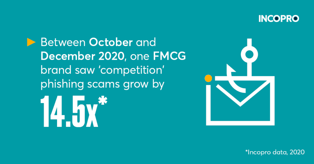 Between October and December 2020, one FMCG brand saw ‘competition’ phishing scams grow by 14.5x (1350%) on Facebook (Corsearch data from 2020) [12]