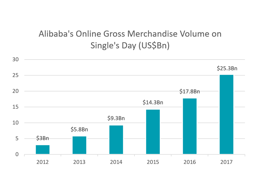 With a third of the Chinese population purchasing items during Singles’ Day alone, Alibaba is expected to generate an eye-watering US$37bn in gross merchandising value from the event.
